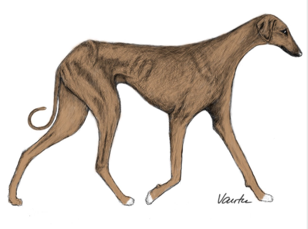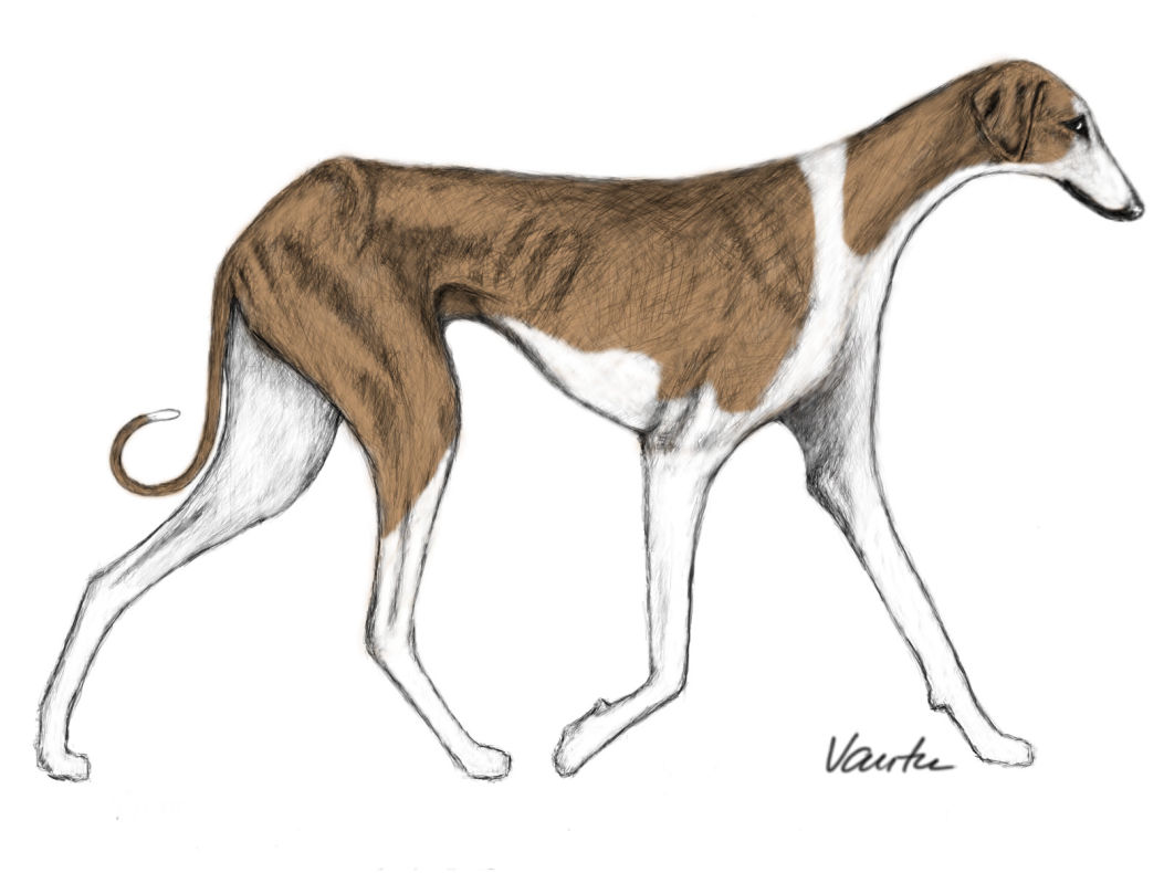 ”BRIEF HISTORICAL SUMMARY: It is an African sighthound descending from the types pictured in the wall paintings of the Central Sahara which date back thousands of years. The ever- increasing aridity of the Sahara caused Tuareg, Dahoussahaq and Peul shepherd-hunters to migrate with their dogs to the more hospitable lands of the Sahel: in areas suitable for farming and hunting along the dry valley of the Azawakh. Belonging to the culture of peoples who domesticated and shaped it, it is known as Oska in the Tuareg language. European enthousiasts discovered the breed with admiration and selected with the help of the breeders who owned the first lines exported to Europe, as of 1968.”