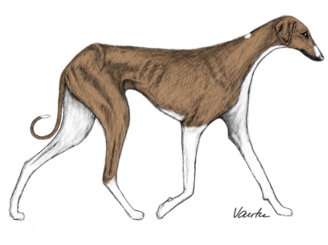Set low, long, thin, lean and tapered. Covered with the same type of hair as the body, it often has a white pencil hair on the end. The tail hangs with the tip slightly raised, but it can rise above the horizontal when the dog is excited.