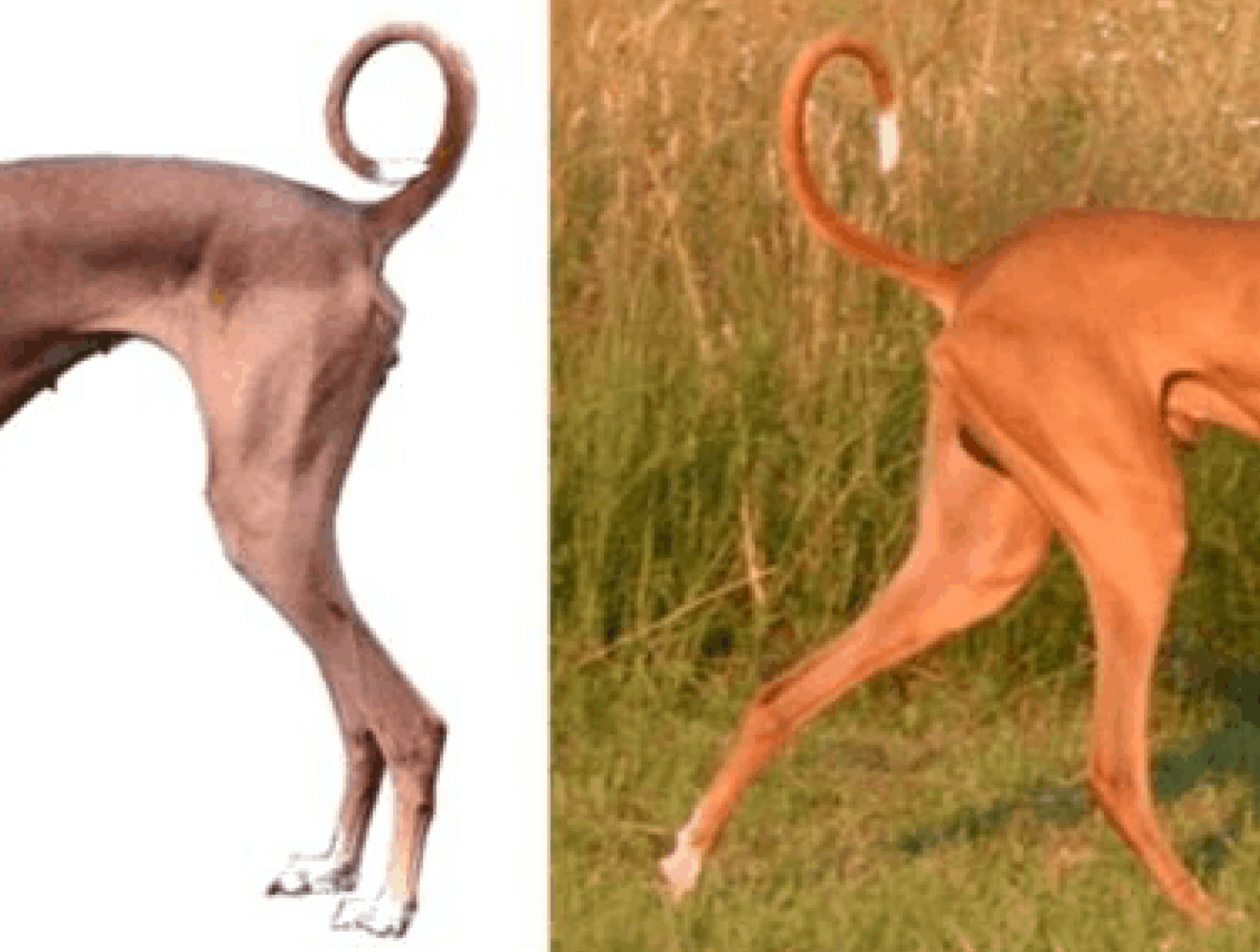 Over coiled tail set too high, poor top line and croup. / Well set and carried tail, correct croup.